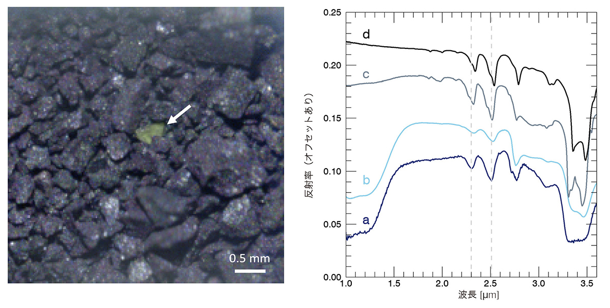 また、MicrOmegaによる分光撮像で、直径0.5mm程度の比較的大きな炭酸塩や水酸化塩の粒子も見つかった。炭酸塩や水酸化塩はリュウグウの物質が過去に液体の水による変質(水質変成)を受けたことを示すもので、注目すべき結果だ。