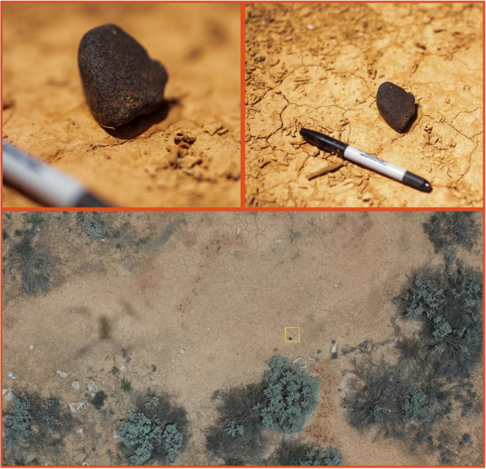 (左上・右上)今回発見された隕石。隣に置かれたペンの長さが約15cm。(下)ドローンの捜索画像から検出された隕石。黄色の四角のサイズは1辺が22cm。画像クリックで表示拡大(提供:Anderson et al. (2022))