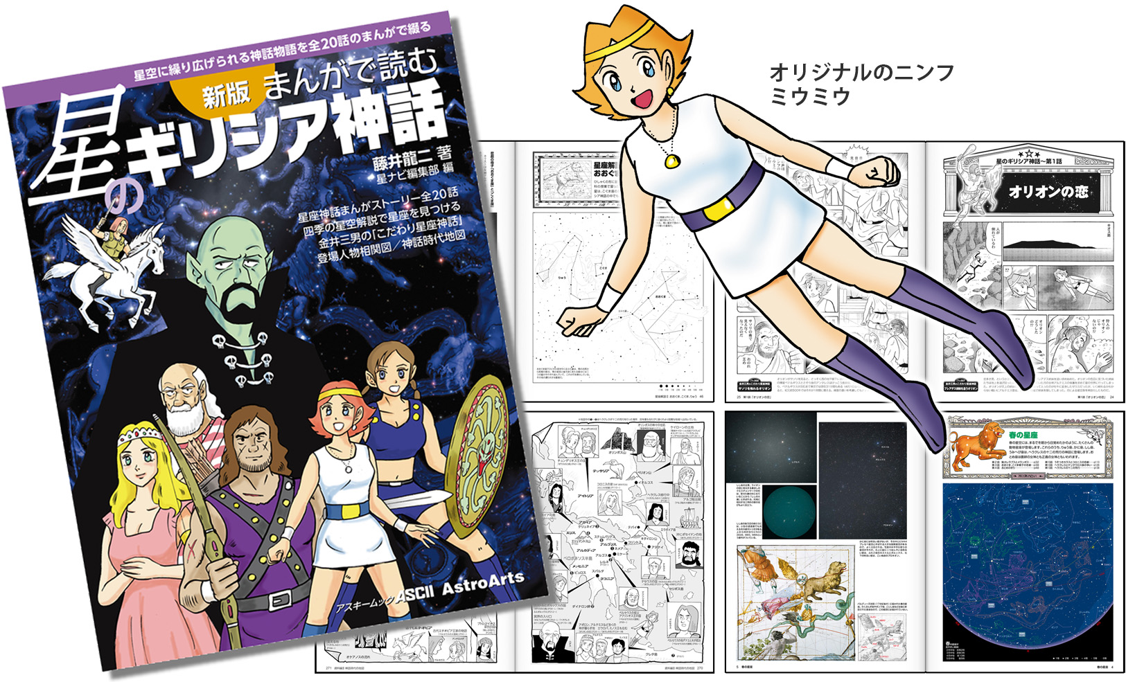 ギリシア神話の舞台は、ギリシャ周辺だけでなく地中海沿岸のヨーロッパから北アフリカ、中近東、西アジア、黒海沿岸にまで及ぶ広大な地域にまたがっており、それぞれの神話の成立も幅広い年代にわたっている。『まんがで読む星のギリシア神話』は、オリジナルキャラクター「ミウミウ」を登場させて案内役に仕立て、いくつものギリシア神話のストーリーをひとつながりにまとめている。本来なら幾世代にもわたる神話を同時代に設定し、星座神話の全体像をつかめるように再構成しているのが特徴だ。また、膨大なストーリーゆえに登場人物も多くて混乱しがちだが、まんがのビジュアルで見た目や特徴が描き分けられたことで、それぞれのキャラクターがより際立ってわかりやすくなっている。