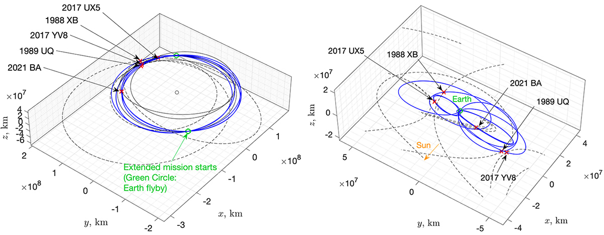 こうした状況のなか、1機の探査機で複数天体をフライバイする「マルチフライバイ方式」による探査が注目されている。とくに効率的とされるのが、小惑星をフライバイしては地球に戻ってフライバイし、また別の小惑星をフライバイすることを繰り返す「小天体フライバイサイクラー軌道」だ。地球に戻るたびにスイングバイによって軌道を効果的に曲げることで、燃料を大幅に削減できる。昨年10月に打ち上げられた、木星のトロヤ群小惑星を探査するNASAの「Lucy(ルーシー)」ミッションではこの小天体フライバイサイクラー軌道が採用されており、マルチフライバイが予定されている。