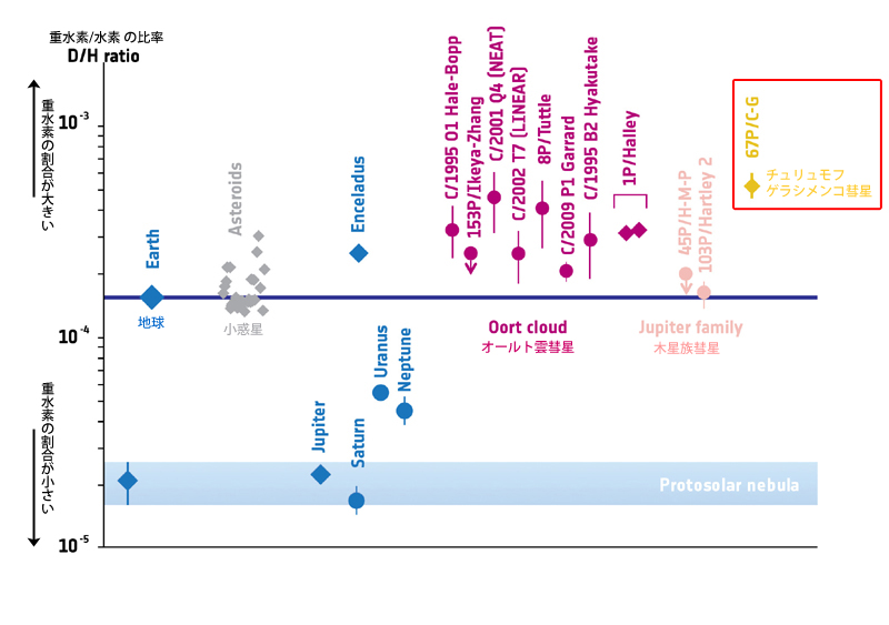 太陽系の天体における重水素の比率。木星族彗星は地球に比較的近い傾向を見せていたが、CG彗星はそれに当てはまらない。クリックで拡大(提供: Data from Altwegg et al. 2014 and references therein)