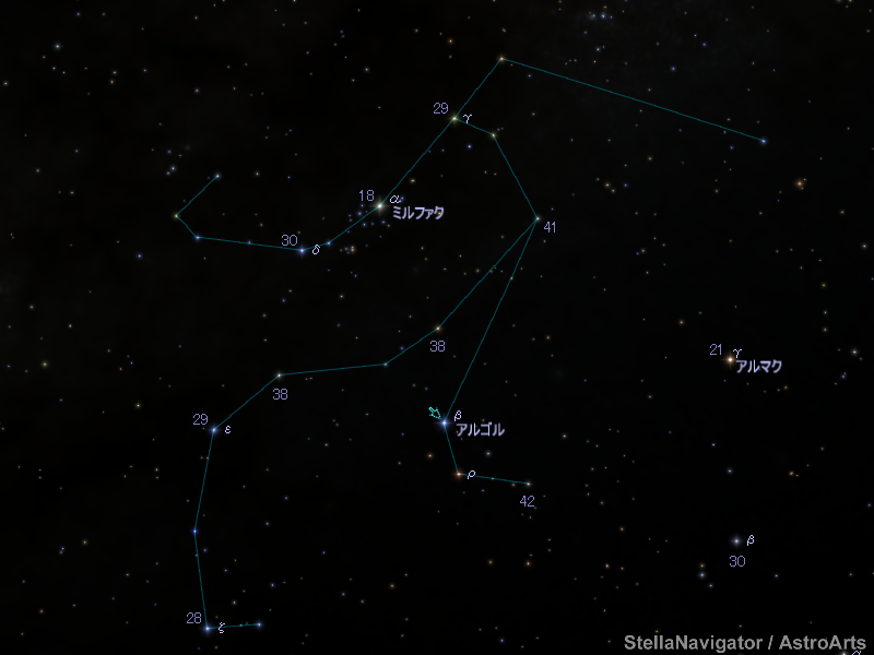 秋の変光星といえば脈動変光星のくじら座ミラが有名ですが、食変光星のペルセウス座アルゴルもよく知られた変光星です。宵から深夜に北東の空に高くなり、見やすい季節を迎えます。