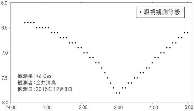 一般的に食変光星の極小時の光度曲線は、伴星が主星を完全に隠してしまう皆既食の場合は平坦な底が見られますが、伴星が主星を完全に隠しきらない部分食の場合は、平坦な底がなく尖った形状になります。ところがカシオペヤ座RZでは、その時々で皆既食になったり部分食になったりするという現象が観測されてきました。