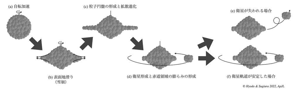 さらに、ばらまかれた粒子は小惑星の赤道面に円盤を形成する。円盤の粒子は衝突や自己重力によって内側にも外側にも拡散していくが、内側に移動した粒子は小惑星に積もり、赤道領域を膨らませる。一方、外側の粒子は自己重力で集まり、衛星となる。衛星は軌道が広がって最終的に小惑星から離れてしまうこともあれば、軌道が安定することもあると考えられる。