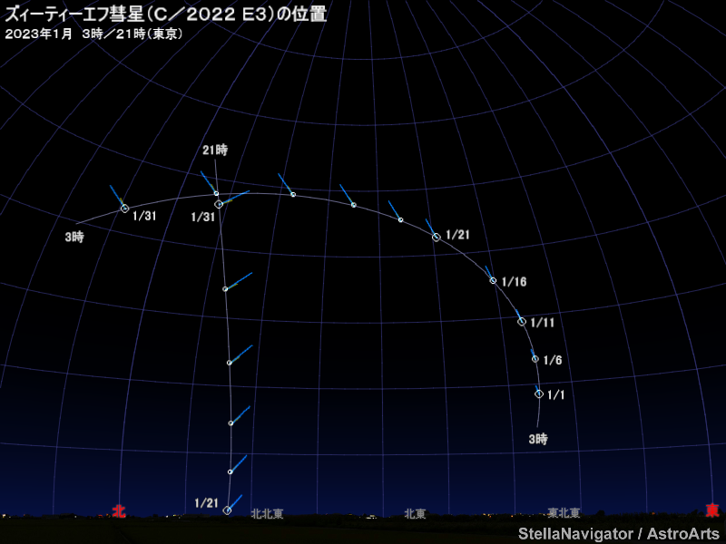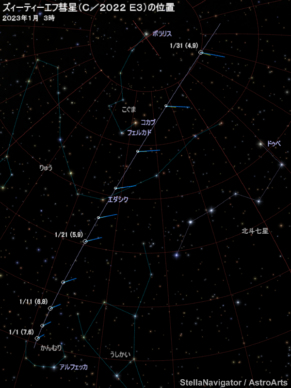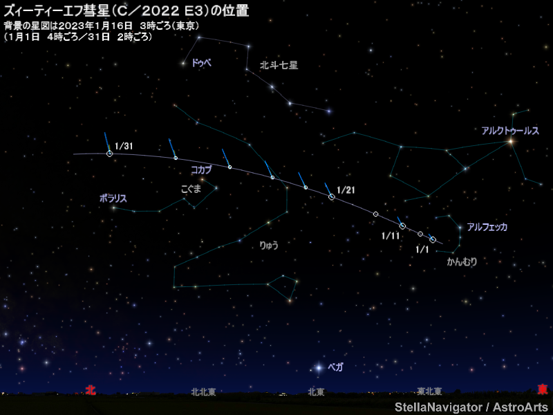 1月から2月にかけて、ズィーティーエフ(ZTF)彗星(C/2022 E3)が明るくなると予想されている(2月の見え方はこちら)。