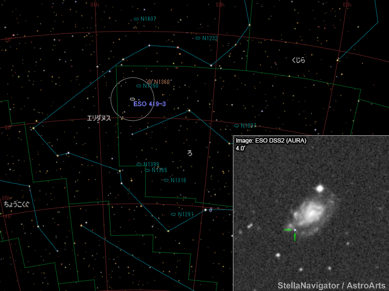 ESO 419-3周辺の星図と、DSS画像に表示した超新星。画像クリックで星図拡大(「ステラナビゲータ」で星図作成。DSS画像の版権について)