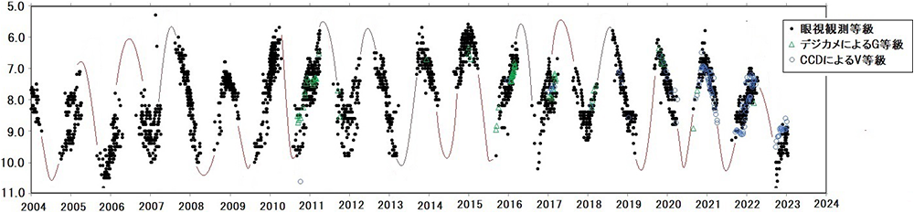 2004~2023年のうさぎ座Rの光度。画像クリックで表示拡大(VSOLJメーリングリストのデータから高橋さん作成、以下同)