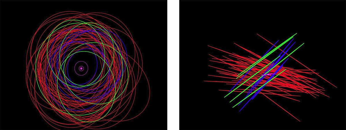 土星の衛星の軌道図。(左)土星の極方向から見た図、(右)土星の赤道方向から図。赤、緑、青が不規則衛星(土星から遠く、楕円で傾いた軌道を持つ衛星)を表す。今回発表された新衛星は全て外側の軌道を回る不規則衛星。画像クリックで表示拡大(提供:Scott Sheppard/Carnegie Institution for Science)