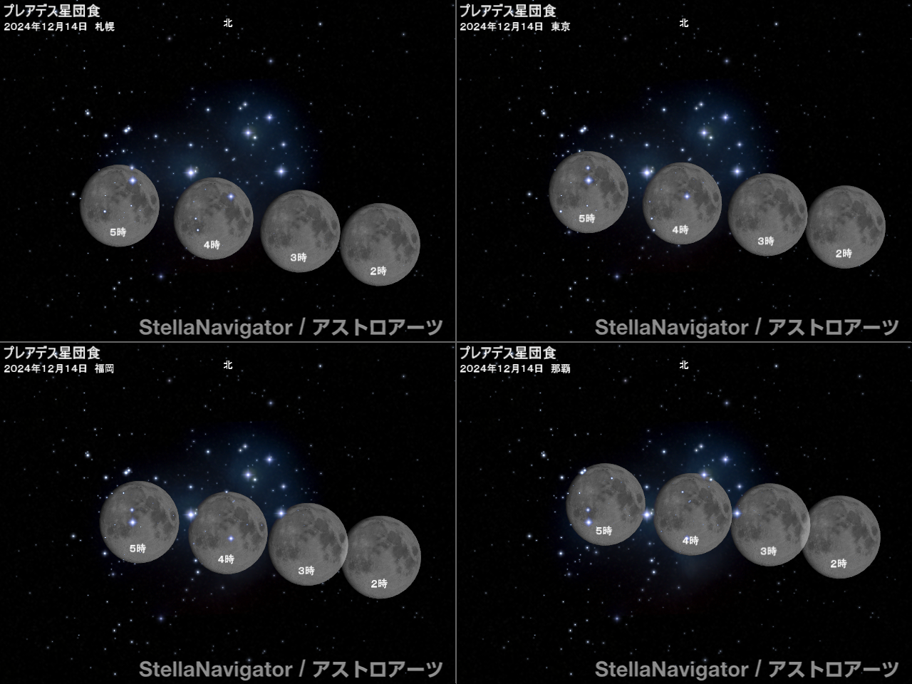 12月14日の3時ごろから5時ごろにかけて、月齢12~13の満月前の明るい月がおうし座のプレアデス星団(M45、すばる)を隠す星食が起こる。日本で夜間にプレアデス星団食が見られるのは2010年1月25日以来15年ぶりとなる。