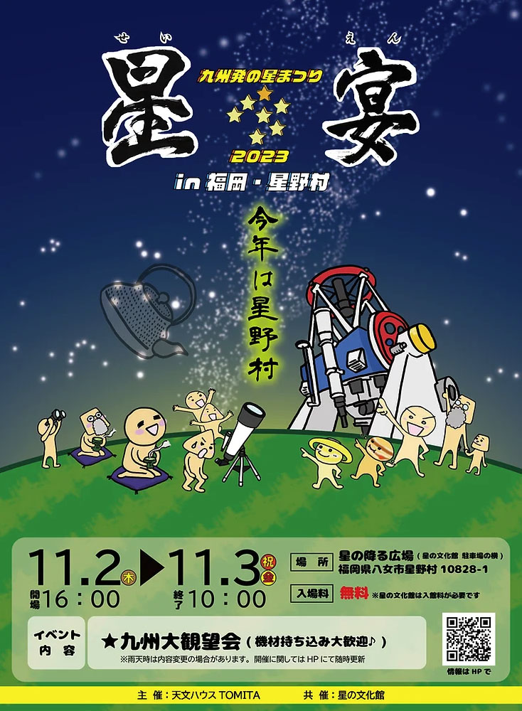 天文ショップTOMITAが主催する大規模な星まつり「星宴(せいえん)」の開催が迫ってきた。2019年~2022年は熊本県阿蘇郡産山村で行われた(2020年はオンラインのみ)星宴だが、2023年は福岡県八女市の「星の文化館」に会場を移しての実施となる。