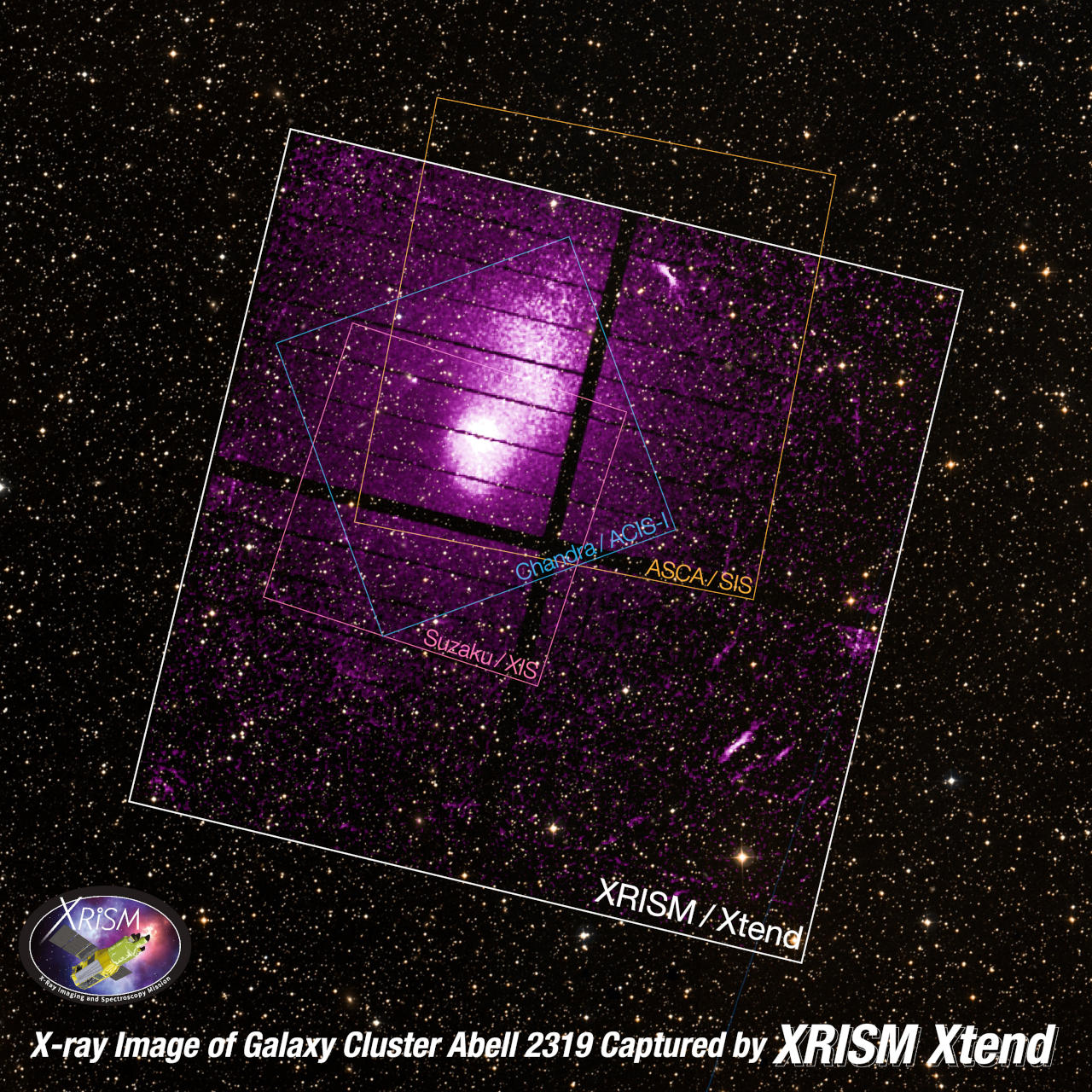 カメラ「Xtend」で撮影したAbell 2319のX線画像(紫色)。DSSによる可視光線画像(カラー)と合成している。十字状・線状の黒い部分はX線CCDアレイのすき間でデータがない部分。各枠線は過去にJAXAの「あすか」「すざく」、NASAの「チャンドラ」がこの天体を撮影した視野とXtendの視野を比べたもの。画像クリックで表示拡大(提供:X線:JAXA、可視光:Digitized Sky Survey)