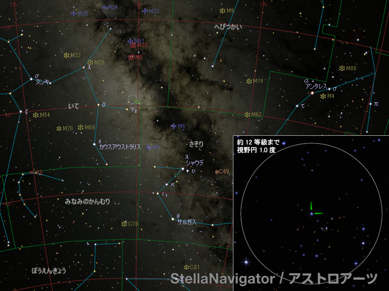 いて座の新星の位置。画像クリックで星図拡大(「ステラナビゲータ」で星図作成)