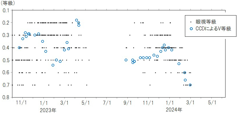 2023年11月以降のベテルギウスの光度。画像クリックで表示拡大(VSOLJのデータから高橋さん作成)