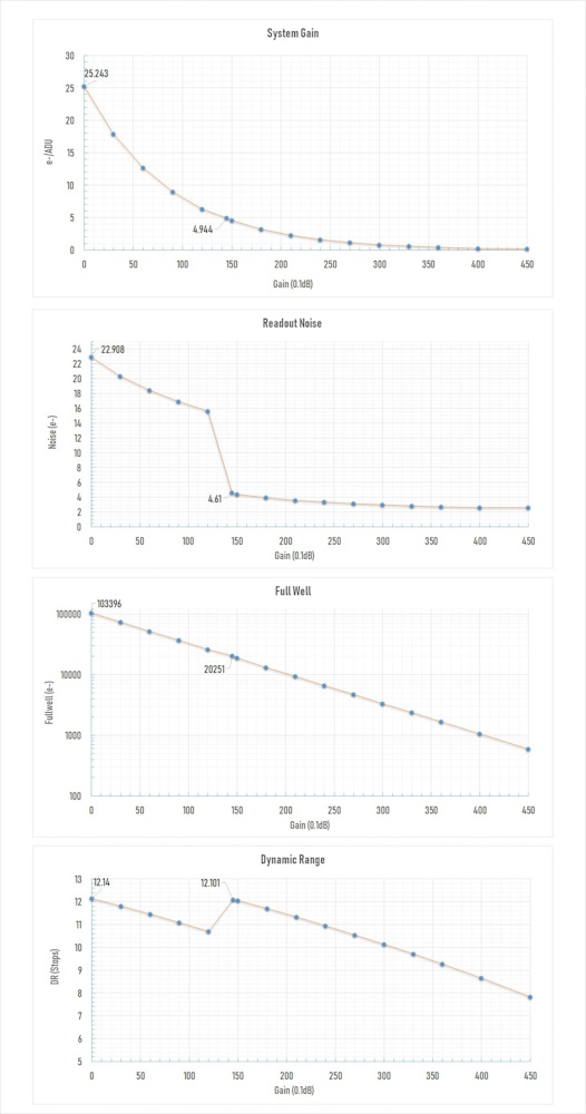 - ゲインが145以上になると自動的にHCG(ハイコンバージョンゲイン)モードに切り替わり、最小2.6e-まで読み出しノイズを抑える。