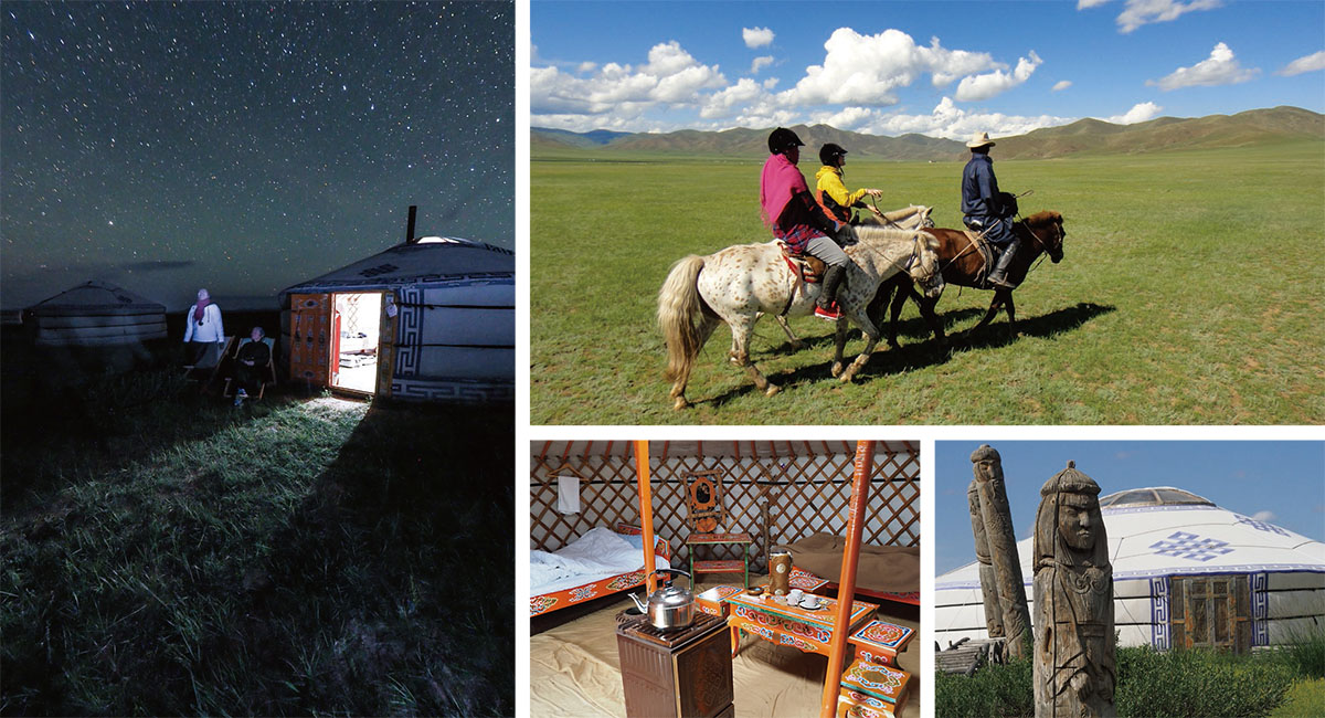 (左)ホテルと違って、一歩部屋を出ればすぐに星空が広がっているのがゲルの良いところ。(右上)遊牧民に手綱を引かれての乗馬体験。(下)ゲルの寝泊まりで、昔ながらの遊牧民の生活を味わえる。画像クリックで表示拡大