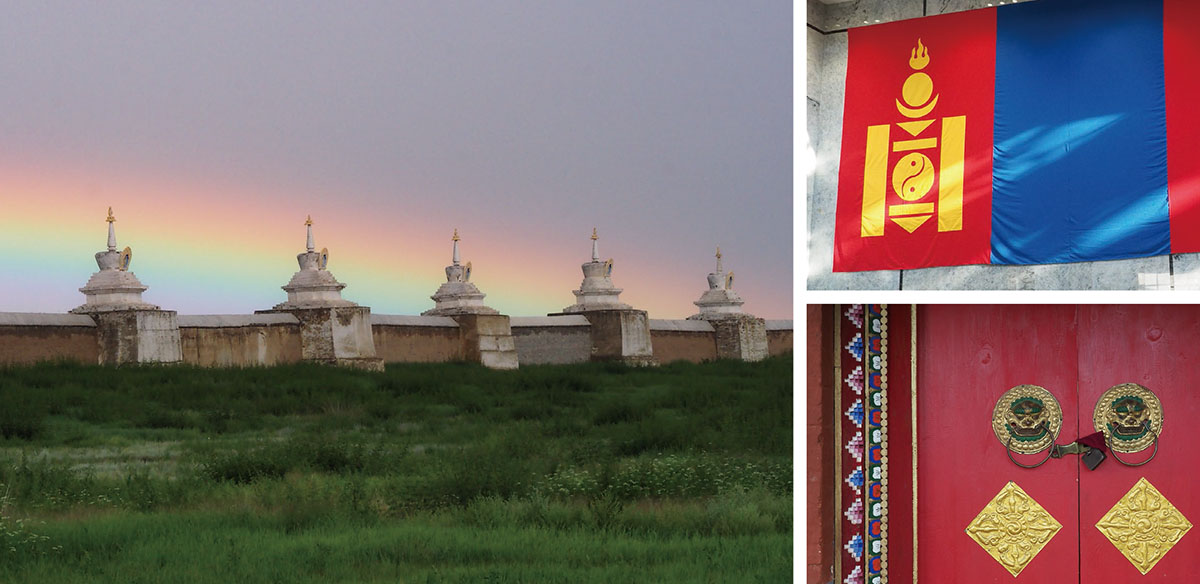 (左・右下)古の都ハラホリンでは、古い仏教寺院や仏塔を見学できる。(右上)モンゴル国旗には、火・地球・水・太陽・月・陰陽が、かつて使われていた文字で表されている。画像クリックで表示拡大