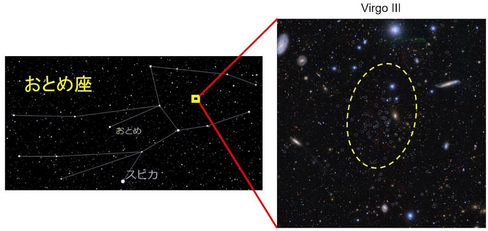 (左)矮小銀河「おとめ座III」の位置。(右)おとめ座IIIを構成する星々(拡大表示した画像に見られる小さな白丸で囲まれた天体)。黄色い破線内に銀河のメンバー星が集中している。画像クリックで表示拡大(提供:国立天文台/東北大学)