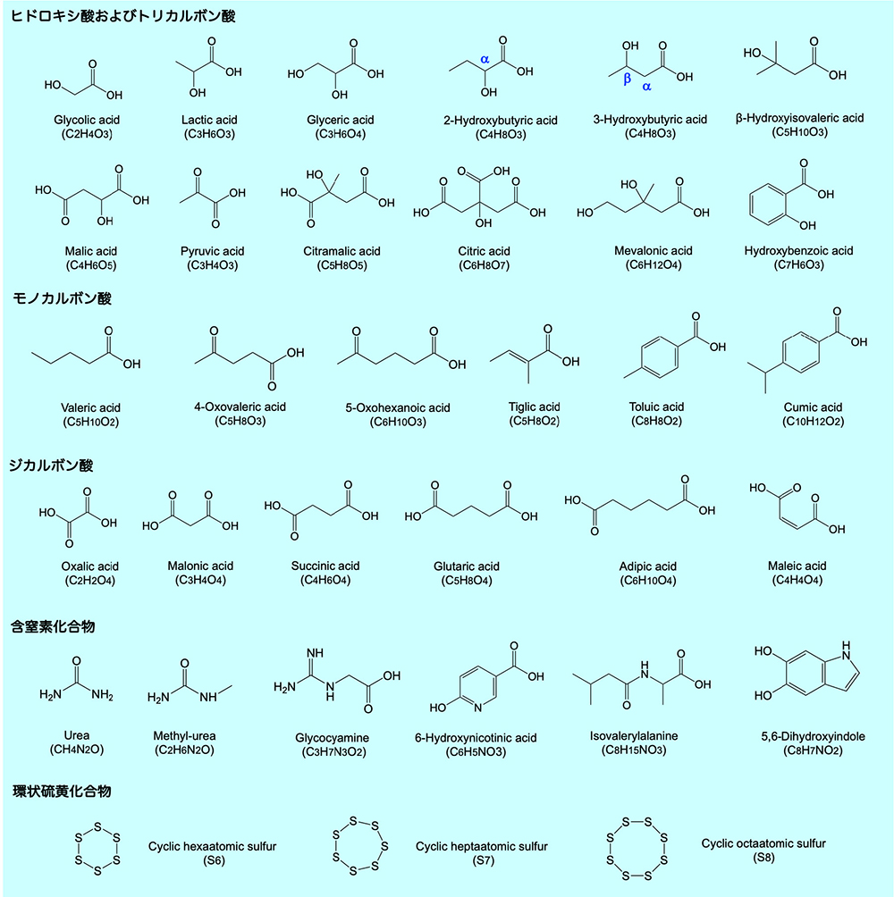 リュウグウ試料から同定された代表的な分子。α-ヒドロキシ酸(グリコール酸、乳酸、2-ヒドロキシ酪酸など)、β-ヒドロキシ酸(グリセリン酸、3-ヒドロキシ酪酸、メバロン酸、ヒドロキシ安息香酸など)、ジカルボン酸ヒドロキシ酸(リンゴ酸、シトラマル酸など)、モノカルボン酸(バレリン酸、4-オキソ吉草酸、5-オキソヘキサン酸、チグリン酸、トルイル酸、クミン酸など)、ジカルボン酸(シュウ酸、マロン酸、コハク酸、グルタル酸、アジピン酸、マレイン酸など)、トリカルボン酸(クエン酸など)、ピルビン酸、他の含窒素化合物(たとえば、尿素、メチル尿素、グリコシアミン=グアニジノ酢酸、6-ヒドロキシニコチン酸、イソバレリルアラニン、およびジヒドロキシインドール)。一番下は新たに同定された環状硫黄化合物(S6、S7、S8)。画像クリックで表示拡大