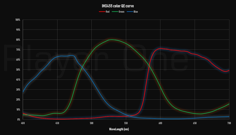 - Player Oneの独自のチューニングにより、IMX455のカタログスペックでは51ke-の飽和電荷容量(FullWell)を71.6ke-まで拡張している。低gainの時は輝度差の大きな対象を撮影しても白飛びしにくく、表現の幅がより広がる。