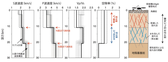次に、モデルを用いて火星地殻での地震波速度を計算したところ、火星の深さ約10~20kmの層に水で満たされた割れ目が存在すると仮定すれば、インサイトが検出した地震波速度の不連続構造を説明できることが明らかになった。また、縦波と横波の比がこの領域で上昇していて、水で満たされた割れ目が存在するモデルと調和的であることもわかった。