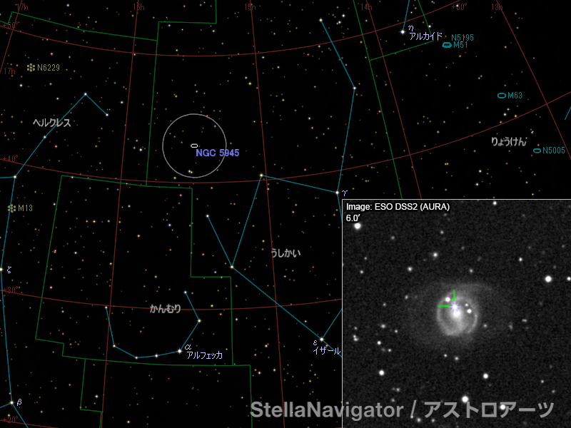 NGC 5945周辺の星図と、DSS画像に表示した超新星。画像クリックで星図拡大(「ステラナビゲータ」で星図作成。DSS画像の版権について)