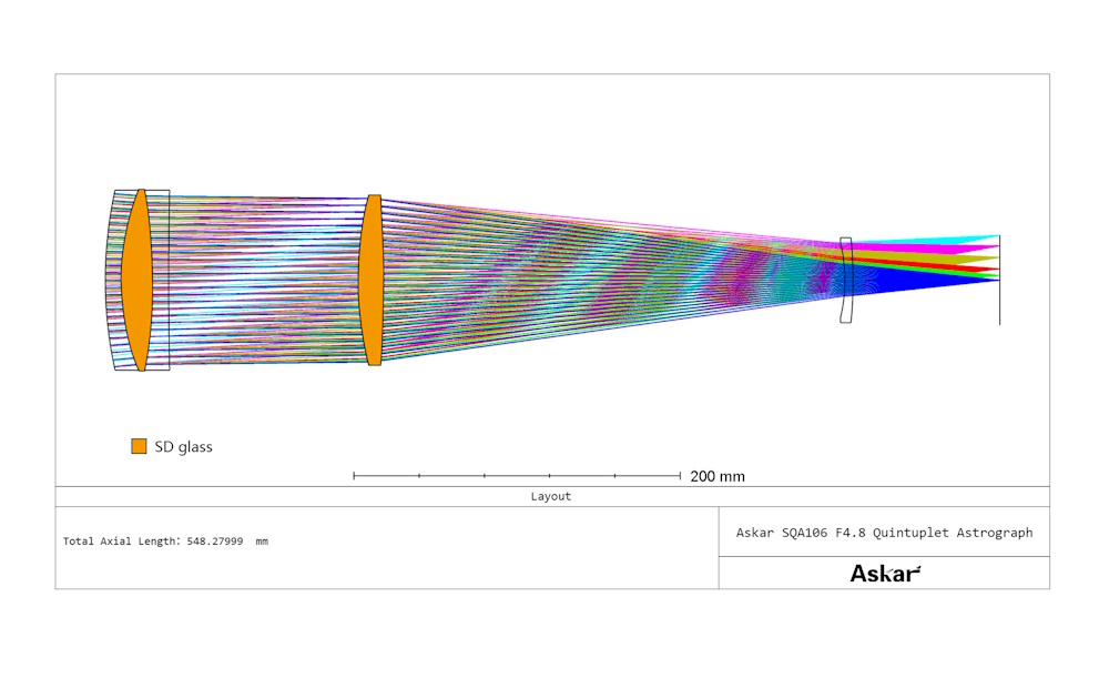 SQA106 鏡筒は、対物レンズ口径106mm、5群5枚のレンズ構成のうち、2枚にSD(超特殊低分散)レンズを使用したペッツバールタイプの光学系が採用されているほか、これまでの天体望遠鏡とは一線を画す驚異的な結像性能を持ち、天体撮影に最適な設計が施されており、天体写真撮影家におすすめの鏡筒だ。