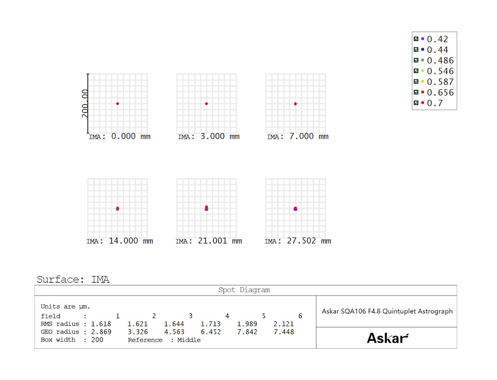 - 中心スポットダイアグラム半径は設計値で1.6μm、イメージサークル55mmの最周辺でも2.1μmという、これまでの天体望遠鏡とは一線を画す驚異的な結像性能を誇る。