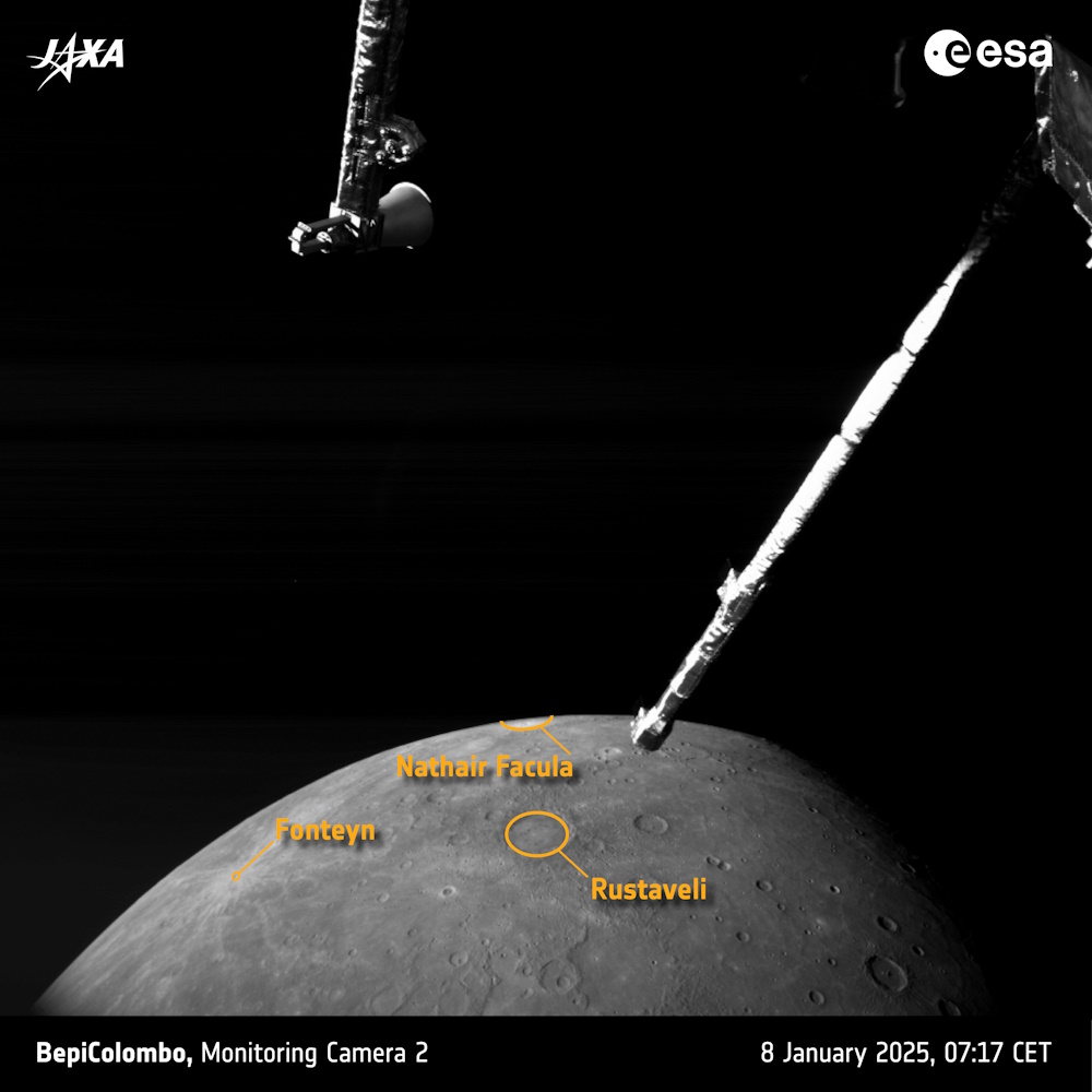 2枚目の画像には、直径約290kmのメンデルスゾーン(Mendelssohn)クレーターやルスタベリ(Rustaveli)クレーターに加えて、直径1500km以上に及ぶ水星最大の衝突クレーター、カロリス盆地(Caloris Basin)も見られる。盆地から伸びる谷の中には明るい溶岩が存在していて、その性質や由来を調べることも探査目標の一つとなっている。