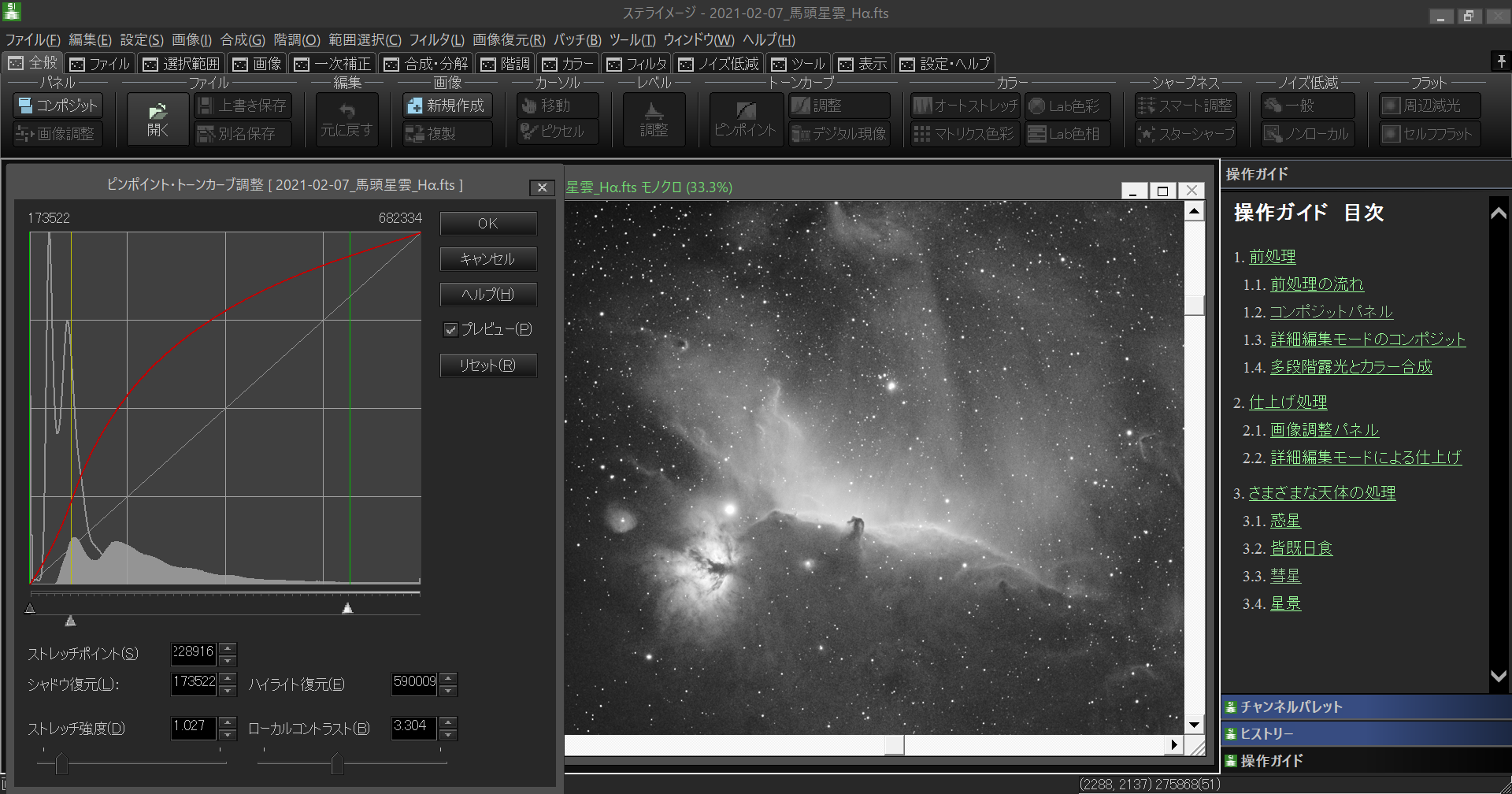 さらに、「ステライメージ10」には画像処理の手順書が組み込まれています。ガイドに従って処理を進めるだけで、天体画像の処理に必要な一通りの作業をこなすことができます。