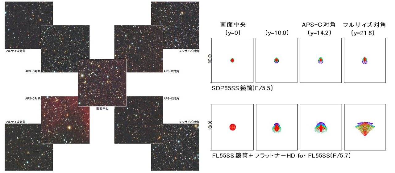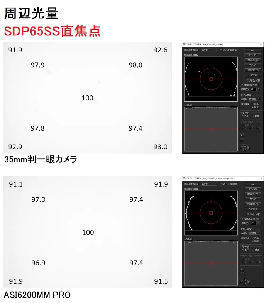 周辺光量(SDP65SS+SDPレデューサー0.8×)。「FL55SS鏡筒+レデューサーHD for FL55SSキット」は、撮影性能で好評を得ているものの、スポットダイアグラムで100μmスケールまで拡大すると周辺像が多少いびつになっている。一方、SDP65SS鏡筒では、星像がバランスよく補正され、丸く整っていることがわかる。画像クリックで表示拡大