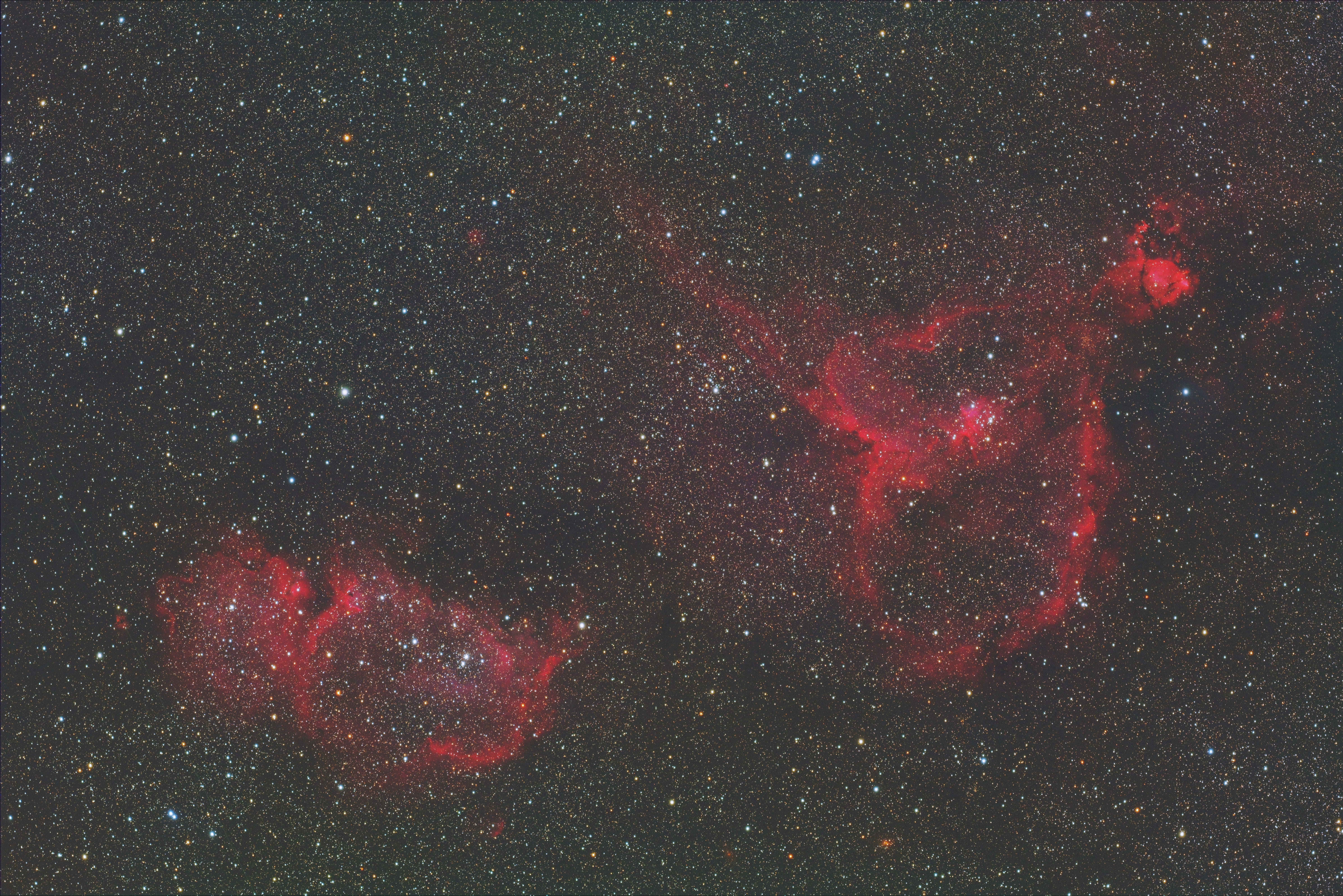 作例「IC 1805(ハート星雲)とIC 1848(ソウル星雲)」(光学系:SDP65SS、カメラ:ZWO ASI6200MM Pro (フルサイズ)、フィルター:LRGBフィルター、露出時間:100分、L 5分×8(Gain 0)、R/G/B 5分×4(Gain 100))。画像クリックで表示拡大