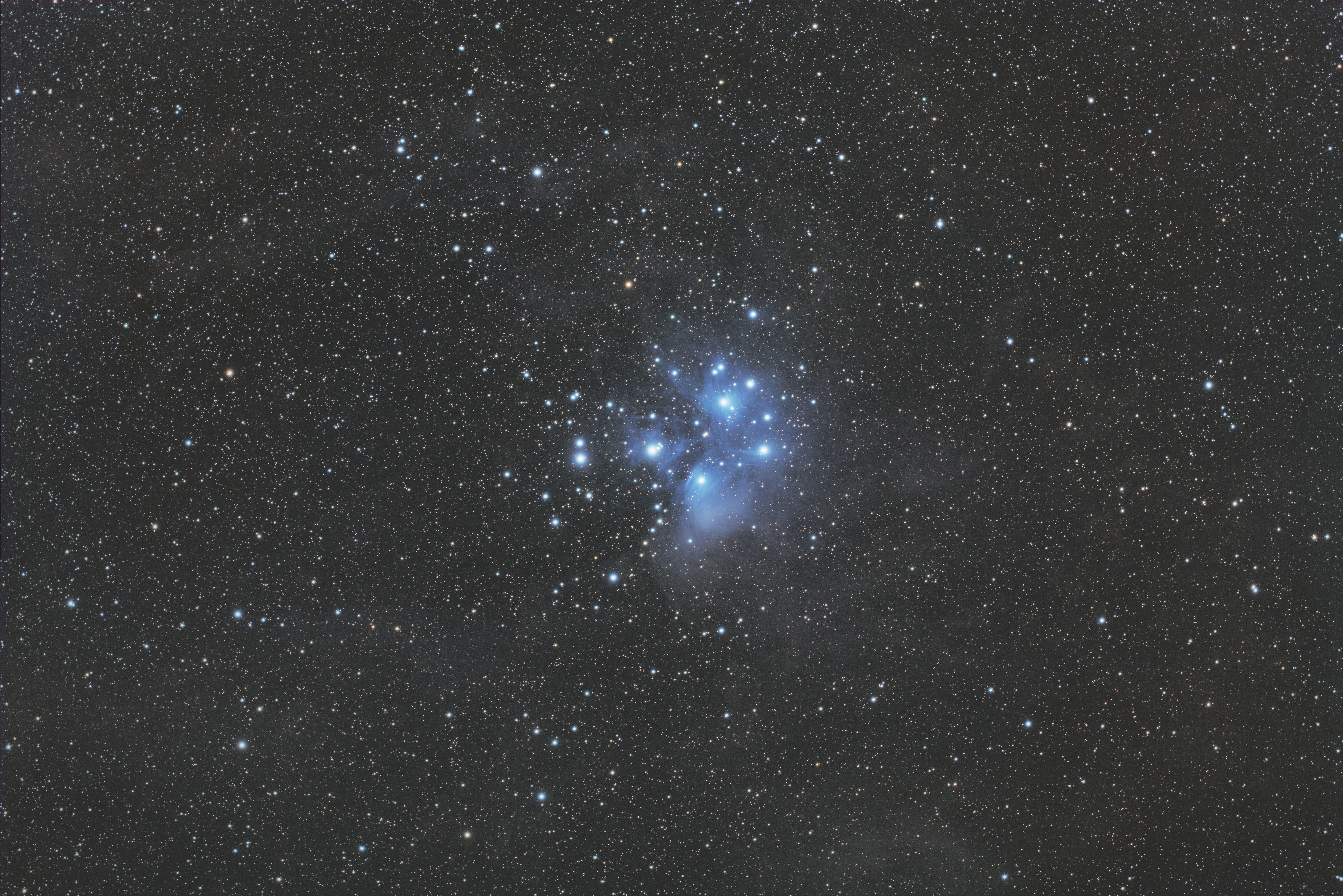 作例「M45(プレアデス星団)」(光学系:SDP65SS+SDPレデューサー0.8×、カメラ:ZWO ASI6200MM Pro (フルサイズ)、フィルター:LRGBフィルター、露出時間:100分、L 5分×8(Gain 0)、R/G/B 5分×4(Gain 100))。画像クリックで表示拡大