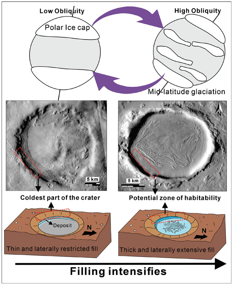 とくに、約6億4000万年前には火星は厚く広範囲な氷に覆われていたが、その後数億年にわたって氷の量は減少を続け、最も最近の氷の蓄積時に当たる約9800万年前には、限られた小規模な場所にしか存在しなくなっていた。これは、火星が氷を蓄積しやすい湿潤な時代から氷を保持しにくい寒冷で乾燥した時代へと移行したことを示している。