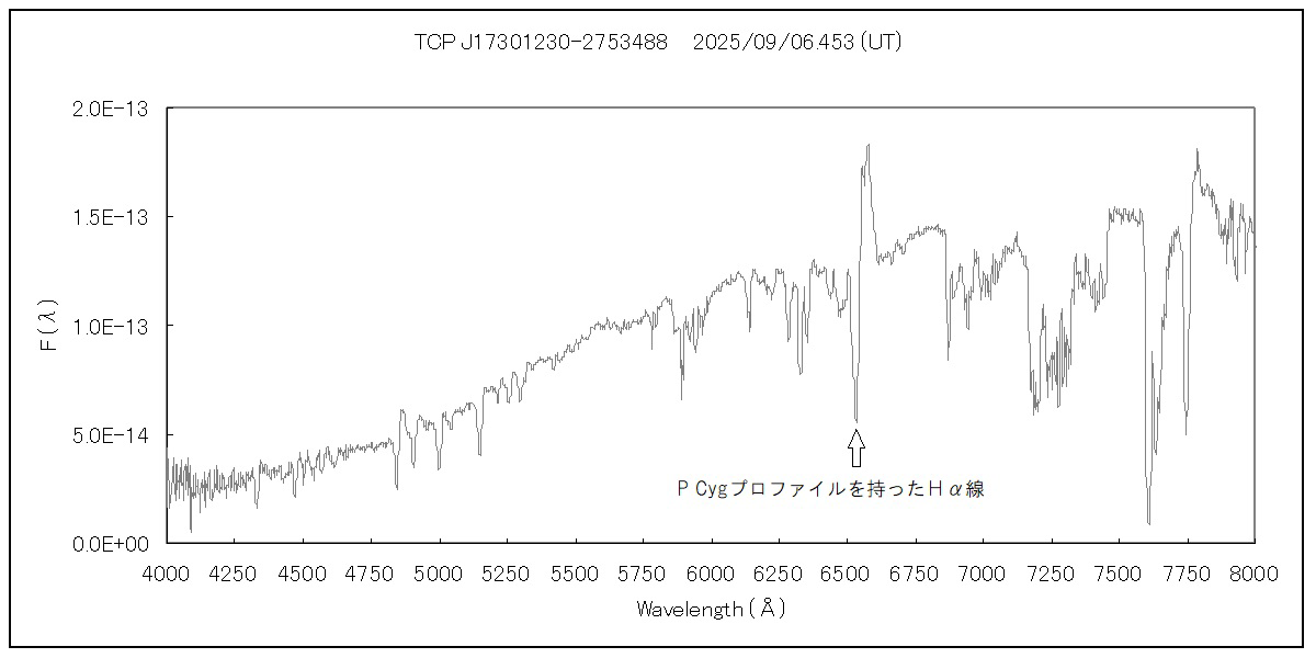 新天体の出現の報を受けて、南アフリカ天文台の反保雄介さんたちが分光観測を行ったところ、P CygプロファイルをともなったHα輝線などが確認されました。また、岡山県の藤井貢さんによる分光観測でも同様の輝線が観測され、この天体が古典的新星であることが確認されました。