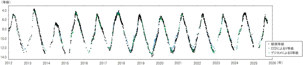 はくちょう座χの光度(2012~2025年)。画像クリックで表示拡大(VSOLJのデータから高橋さん作成)