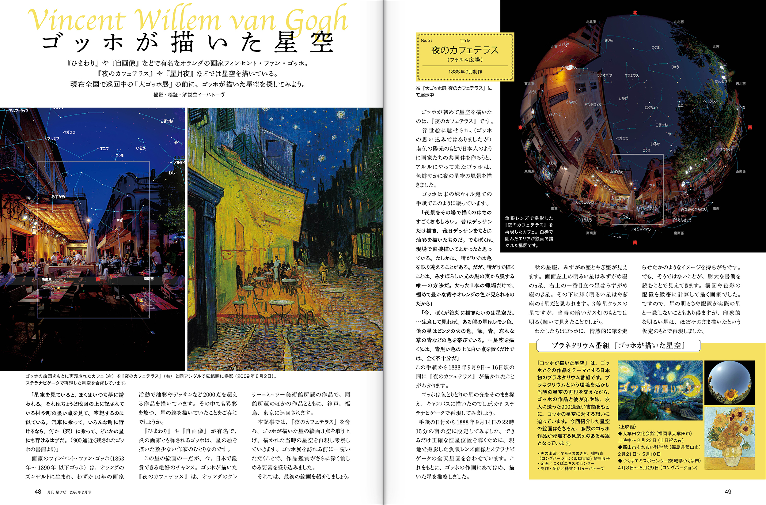 『ひまわり』や『自画像』が有名な画家のフィンセント・ファン・ゴッホは、星の絵を描いた数少ない作家のひとりです。この星の絵画の1点が、今、日本で鑑賞できる絶好のチャンス。『夜のカフェテラス』など、ゴッホが描いた星の絵画3点を取り上げ、描かれた当時の星空を再現し考察していきます。ゴッホはその時何を思い、星空を描いたのでしょうか。