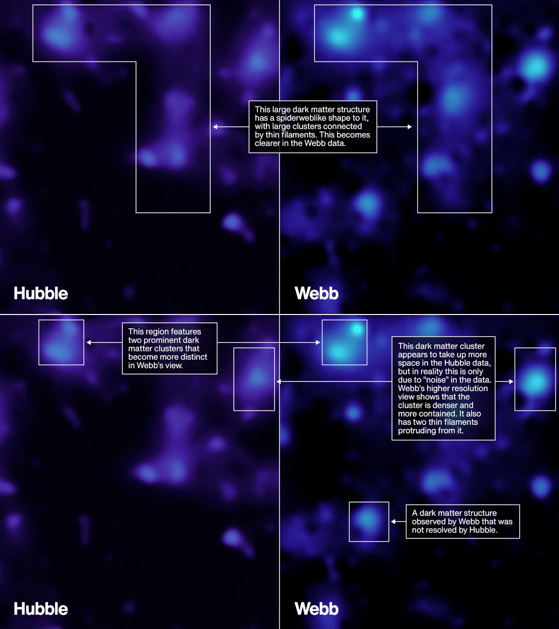 HSTとJWSTで得られたダークマター分布の比較。明るい部分ほどダークマターが濃く集まっていることを表す。(上)ダークマターの大きな構造同士が細いフィラメントでつながっている様子が、JWSTの画像でよりはっきりととらえられた。(下)左上の2個のダークマターの塊が、JWSTのデータではよりはっきりと見えている。右上のダークマターの塊は、HSTのデータでは広がりを持っているが、JWSTの解析でより中心に集中していることがわかった。左下のダークマターの塊は、HSTのデータでは見えていなかった。画像クリックで表示拡大(提供:NASA/STScI/A. Pagan)