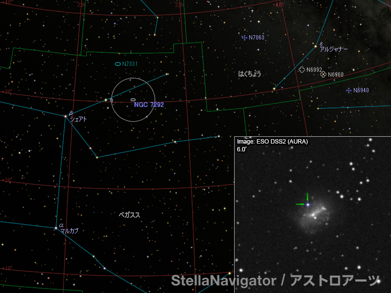 NGC 7292周辺の星図と、DSS画像に表示した超新星。画像クリックで星図拡大(「ステラナビゲータ」で星図作成。DSS画像の版権について)