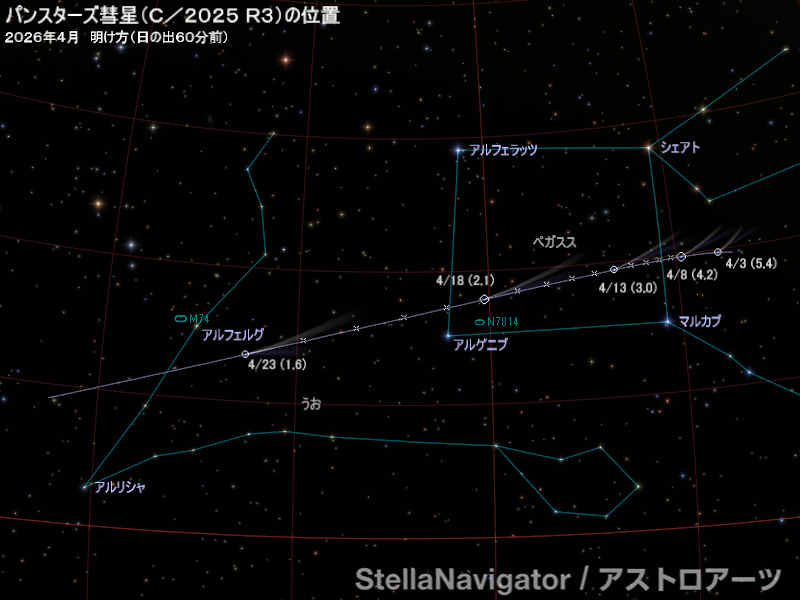 4月上旬から中旬にかけて、パンスターズ彗星(C/2025 R3; PANSTARRS)が3等級前後まで明るくなると予測されている。