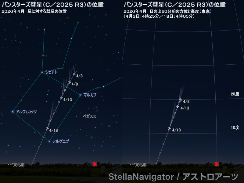 明け方のパンスターズ彗星の位置。左は背景の星に対する位置、右は日の出60分前の方位と高度(場所の設定は東京)。星図はステラナビゲータで作成。画像クリックで表示拡大