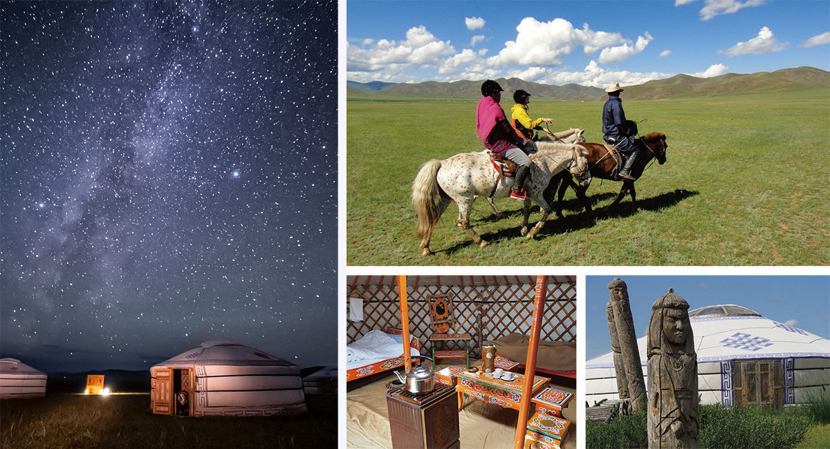(左)ホテルと違って、一歩部屋を出ればすぐに星空が広がっているのがゲルの良いところ。(右上)遊牧民に手綱を引かれての乗馬体験。(下)ゲルの寝泊まりで、昔ながらの遊牧民の生活を味わえる。画像クリックで表示拡大