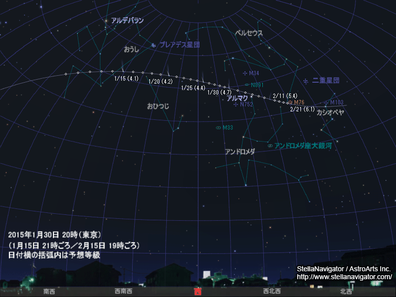 オーストラリアのテリー・ラヴジョイさんが2014年8月に発見したラヴジョイ彗星(C/2014 Q2)が、昨年末から見ごろとなっており、今年に入ってついに4等台に達した。空が暗いところでは肉眼で、明るいところでも双眼鏡があればすぐに見つけることができる。