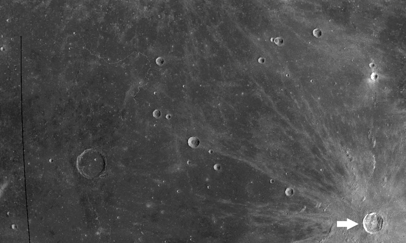 「かぐや」の地形カメラが撮影したケプラークレーター(右下)。放射状に伸びた光条が見える。クリックで拡大(提供:JAXA)
