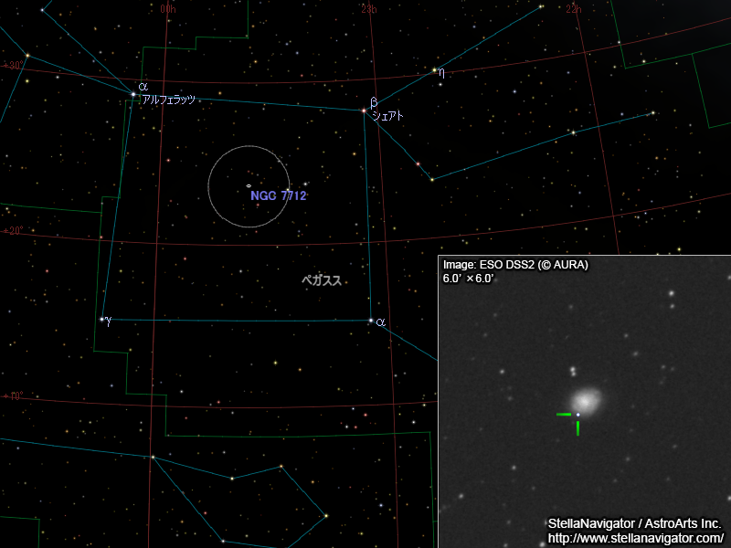 NGC 7712周辺の星図と、DSS画像に表示した超新星。クリックで拡大(「ステラナビゲータ」で星図作成。DSS画像の版権について)