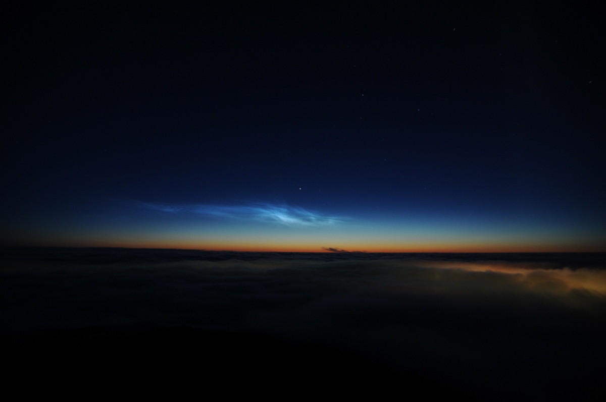 夜光雲は高度80~90kmの中間圏界面と呼ばれる領域で、氷の結晶が太陽光を散乱して光るものだ。通常は極域(緯度60度以上)の夏期に見られるが、温室効果気体である二酸化炭素とメタンの増加によって出現頻度が増加し、出現領域が低緯度に広がると考えられており、地球温暖化の進行度合いを示す可能性がある現象として注目されている。