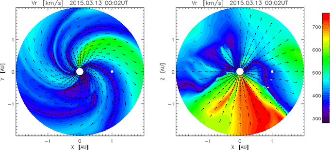 磁気流体シミュレーションによる太陽風スピードの赤道断面図と、南北断面図の動画。中心が太陽、X=1のところにある白い点が地球で、色はスピードを、矢印は磁場の向きを表す。右図での南(下)のほうへ広く噴き出す高速風(赤い部分)の追い風を受けながら、地球の周りの低速風(青と水色の接触面)を押し潰していく様子がわかる。クリックで拡大