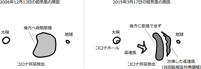 太陽風の「玉突き事故」(2015年3月17日、右)の模式図。玉突きにならなかった場合(2006年12月13日、左)と比べて、後方から高速風の追い風を受け、前方の渋滞した低速風を巻き込んでいる。クリックで拡大(提供:国立極地研究所、以下同)