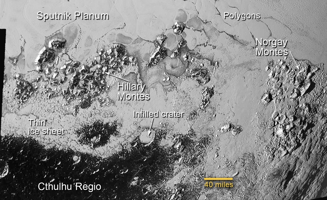 スプートニク平原は窒素だけでなく一酸化炭素やメタンの氷も豊富なようだ。トンボー領域の一番南には古いクレーターの多いクトゥルフ領域があり、暗いこの領域に新しい氷が押し寄せているように見える。中央やや下には氷で埋められたらしいクレーターもある。