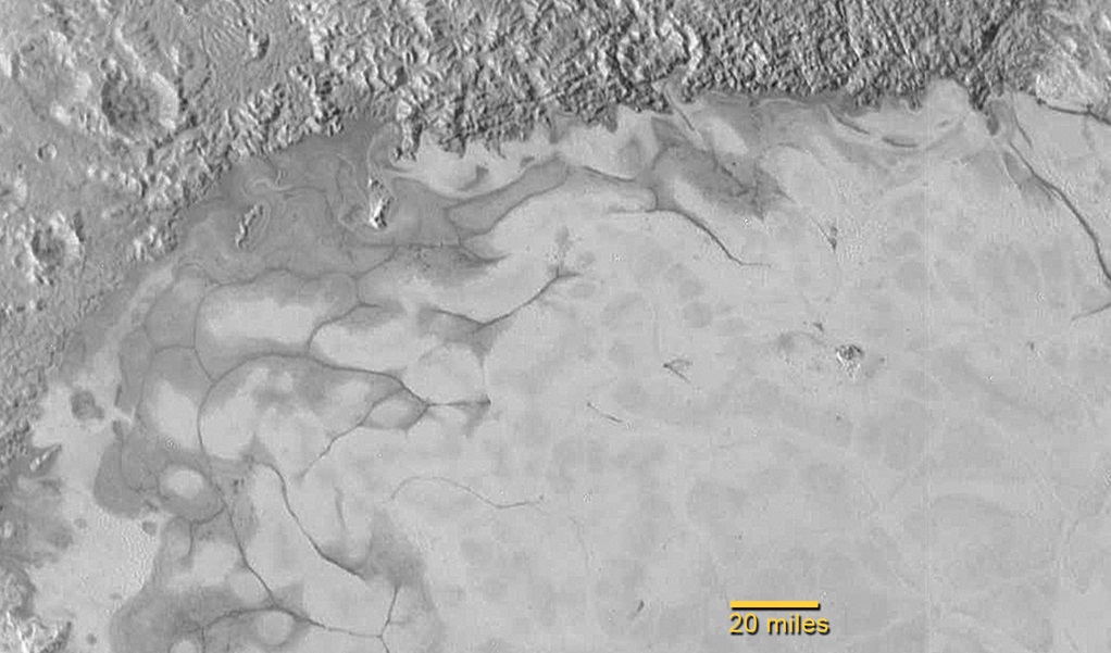 先週金曜日に公開された冥王星のクローズアップ画像では、ハート模様のトンボー領域内の西(ハートの左半分)に位置するスプートニク平原に見られる様々な地形が詳細にとらえられている。興味深いのは広範囲を覆う窒素の氷河(氷床)の流れた跡だ。地球の氷河と同様に、今も流れているかもしれない。