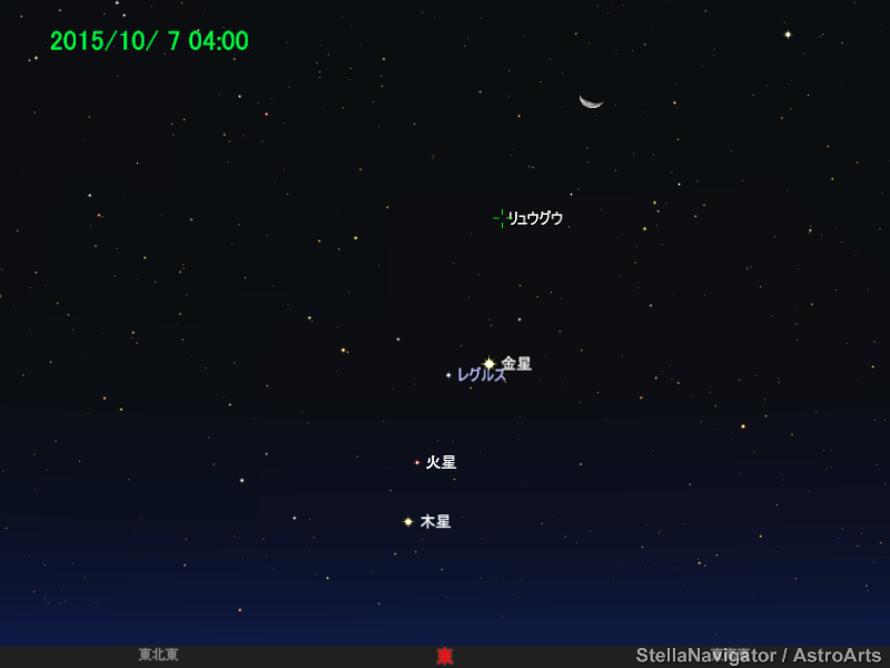 2015年10月5日の地球とリュウグウ、「はやぶさ2」の位置。クリックで拡大(「ステラナビゲータ」で星図作成、以下同)